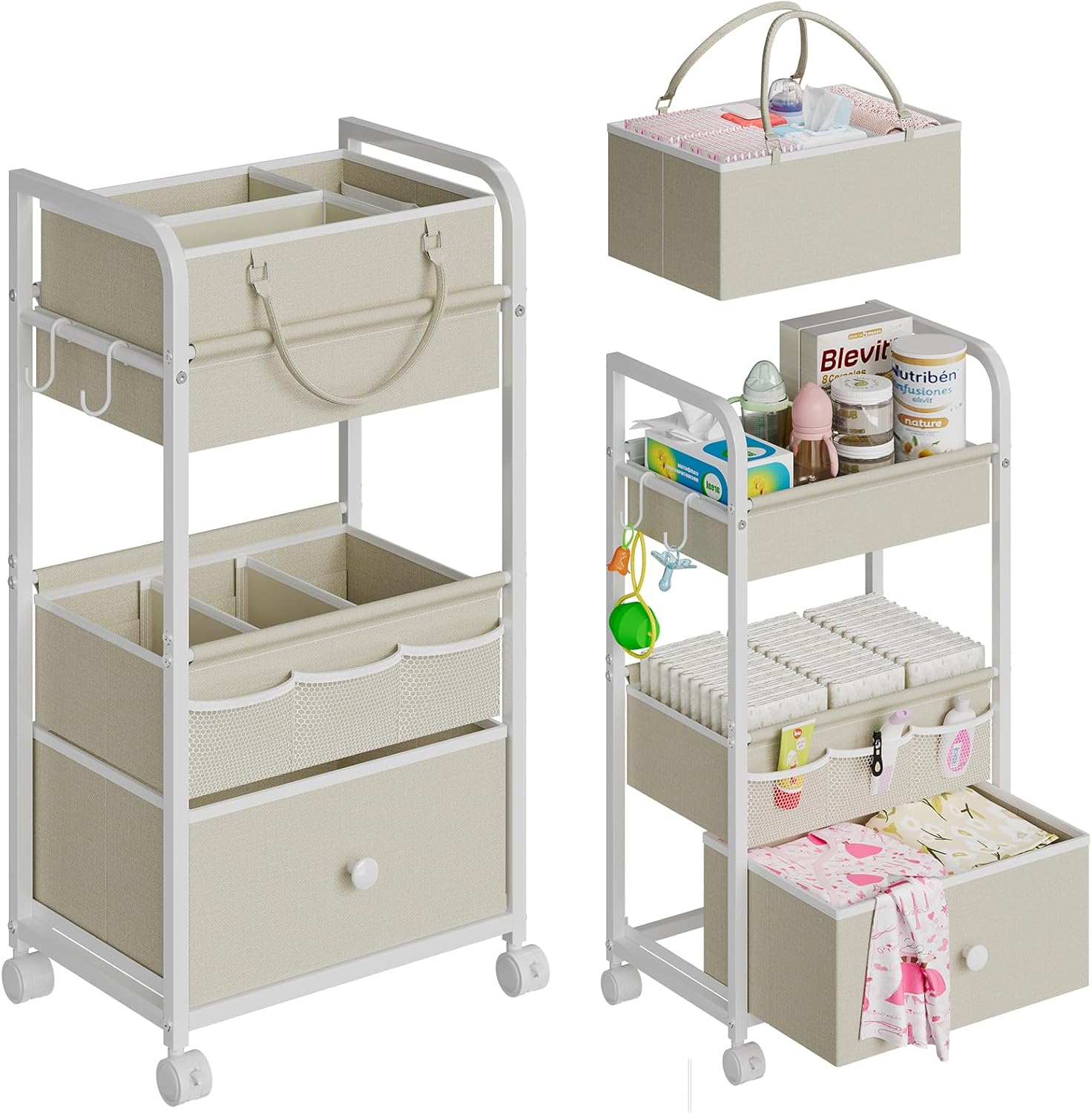 2In1 Baby Diaper Caddy Organizer and Storage, 3 Tier Rolling Cart with Drawer, Detachable Dividers